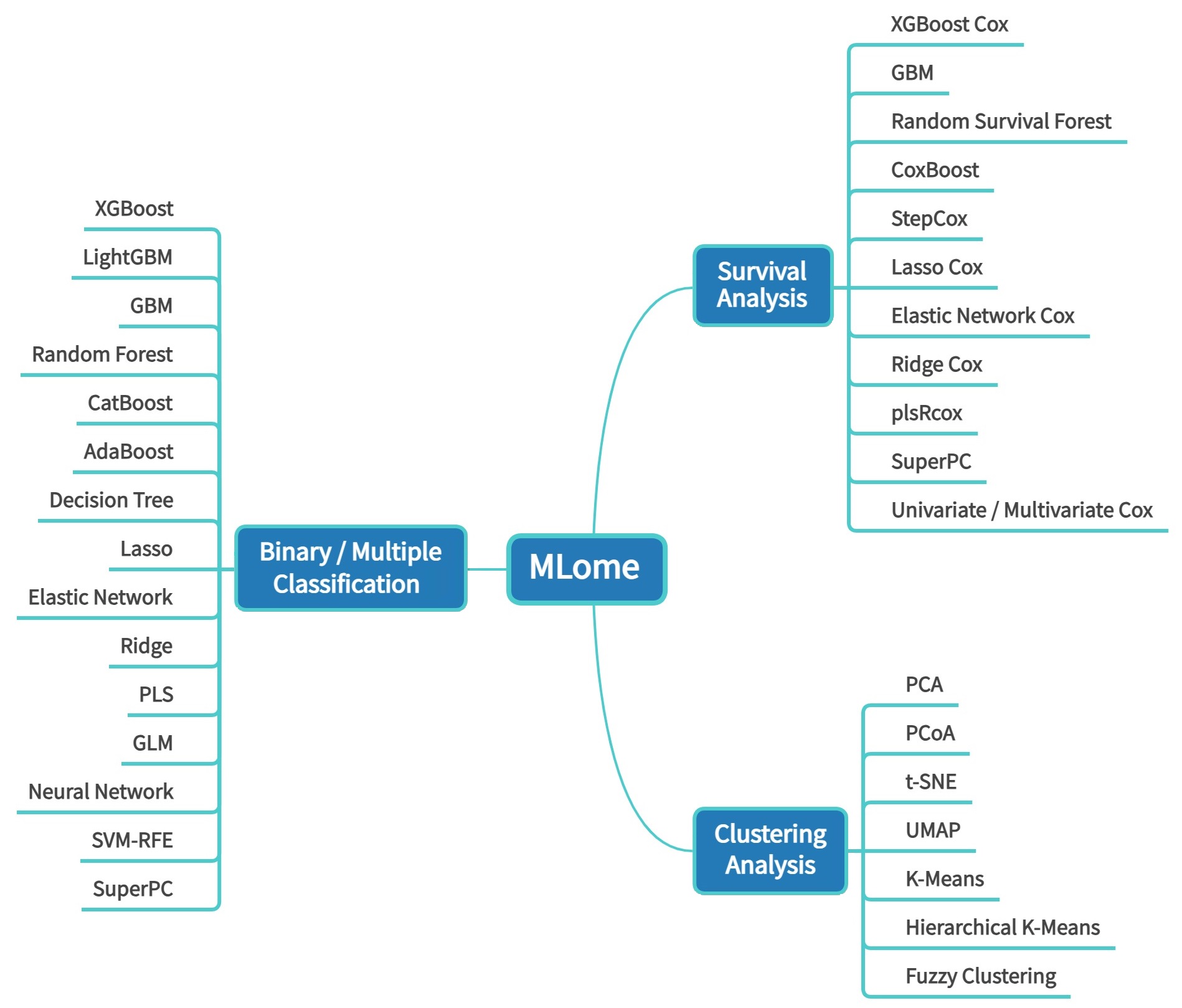 We have developed MLome, a data analysis and visualization platform based on machine learning The platform integrates 15 algorithms for binary/multiple classification analysis, 11 algorithms for survival analysis, and 7 algorithms for clustering analysis, and provides diverse visualization solutions at each stage. For supervised learning of binary/multiple classification and survival analysis, it offers multiple modules such as model generation, feature browse, model evaluation, and model application, helping users screen out key features and obtain appropriate models.