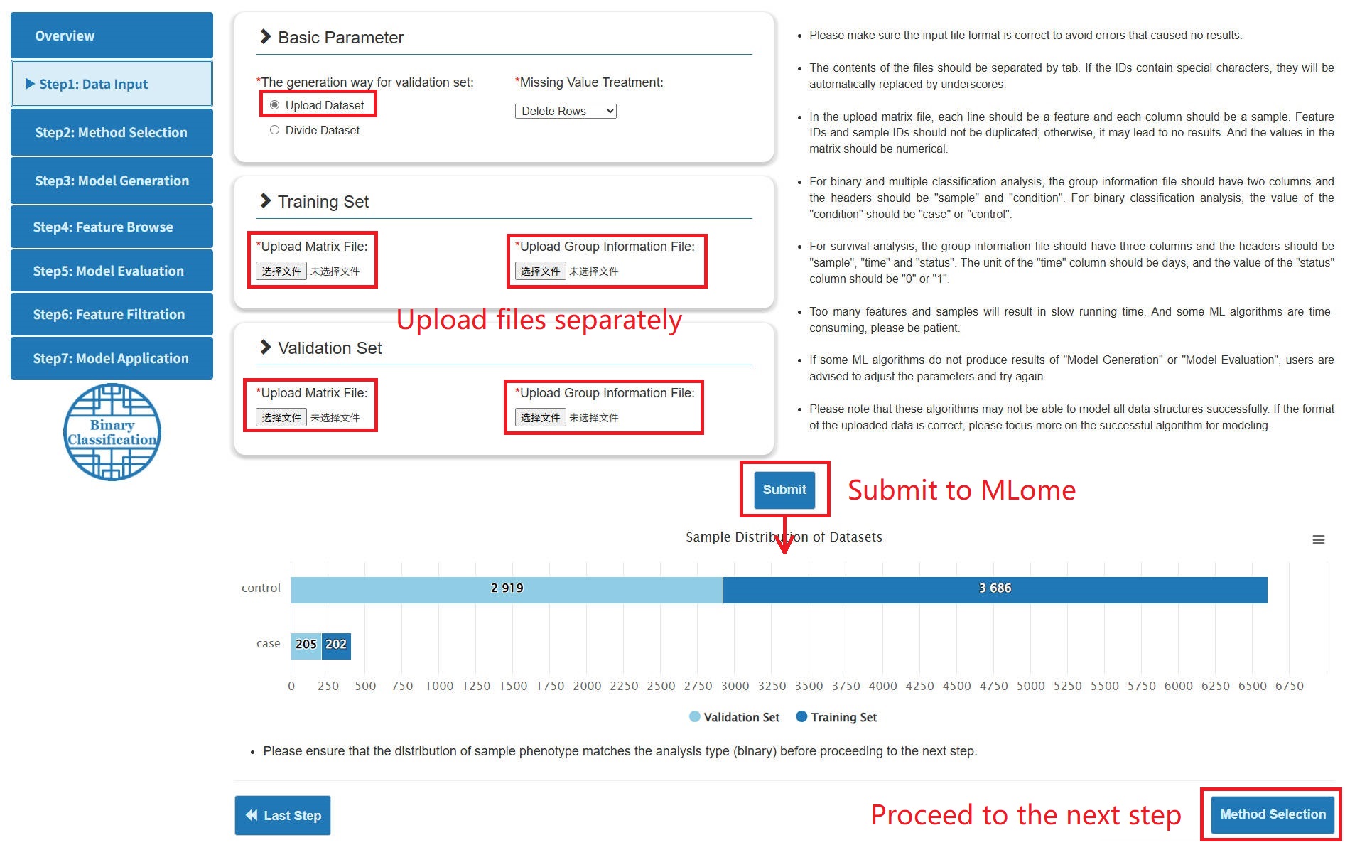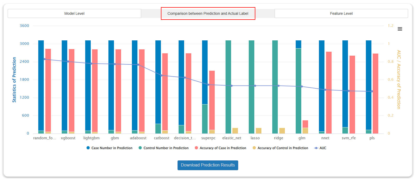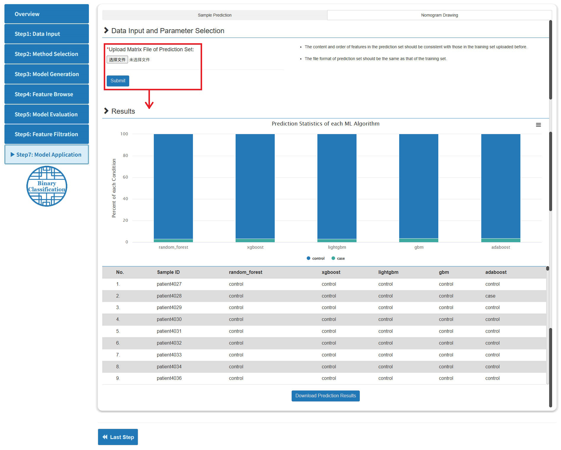 - For the former, users can upload the matrix file to be predicted, and the page will return the prediction results of the model screened out in the previous step.