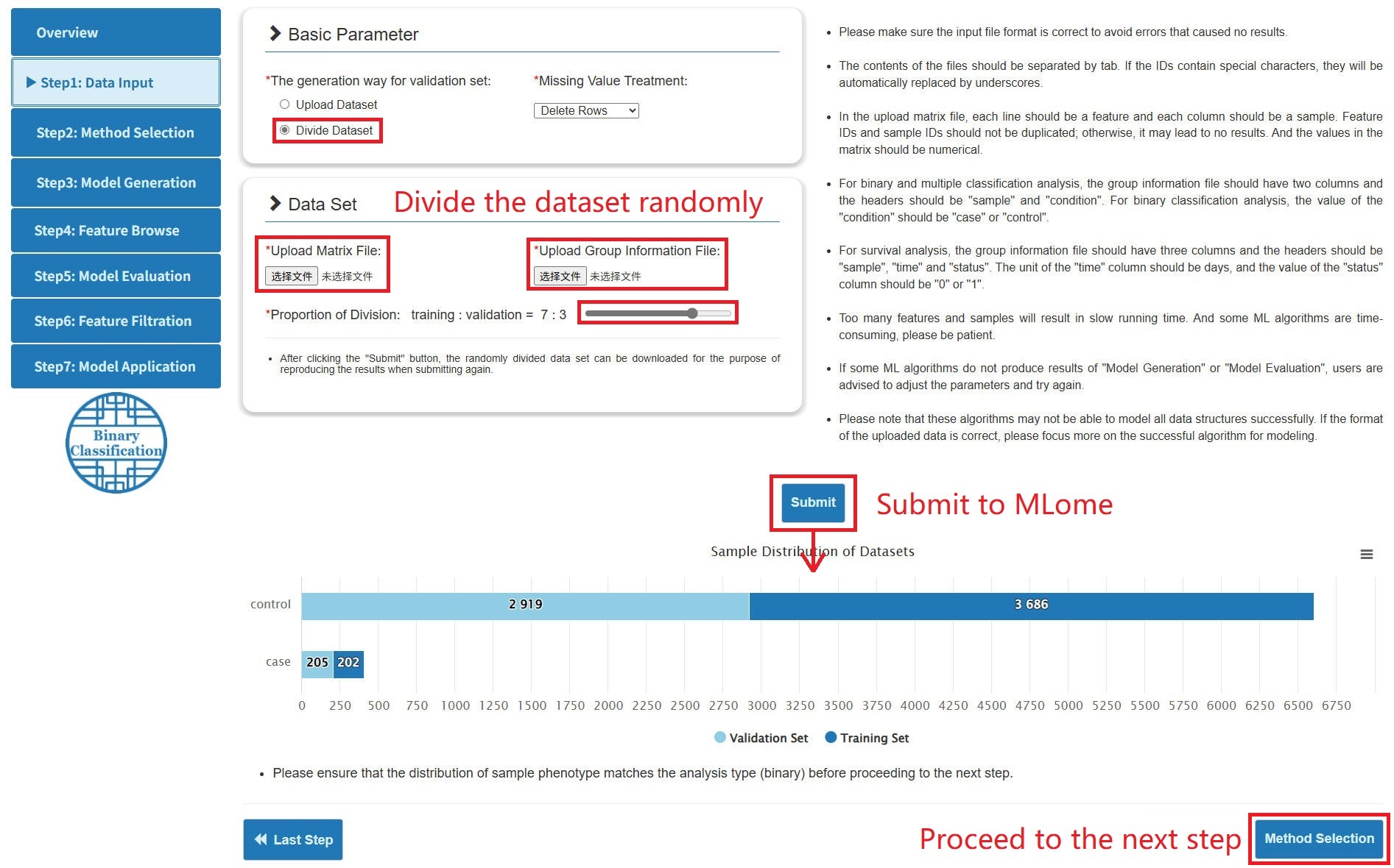 - According to the generation way for validation set, there are two ways to upload files: (1) Upload the training set and the validation set separately. (2) Upload a comprehensive dataset and then randomly divide it into a training set and a validation set according to the scale.