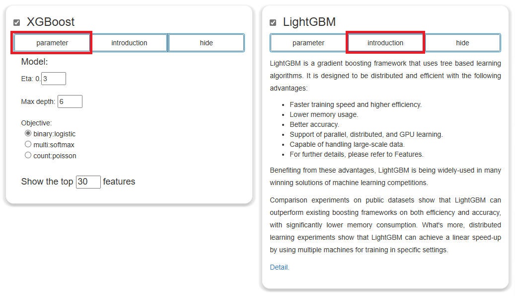 - Click the "parameter" button to display the optional parameters to adjust. Click the "introduction" button to show a simple description of the algorithm.