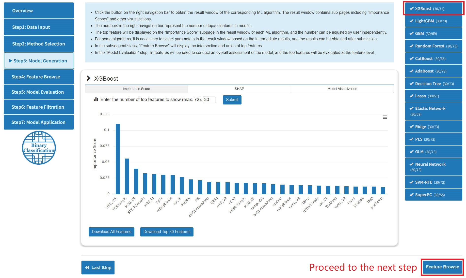 - The "Importance Score" subpage shows the importance score of the top features. Users can independently set thresholds to control the number of top features for subsequent steps. And the "SHAP" and "Model Visualization" subpages explain and visualize the model.