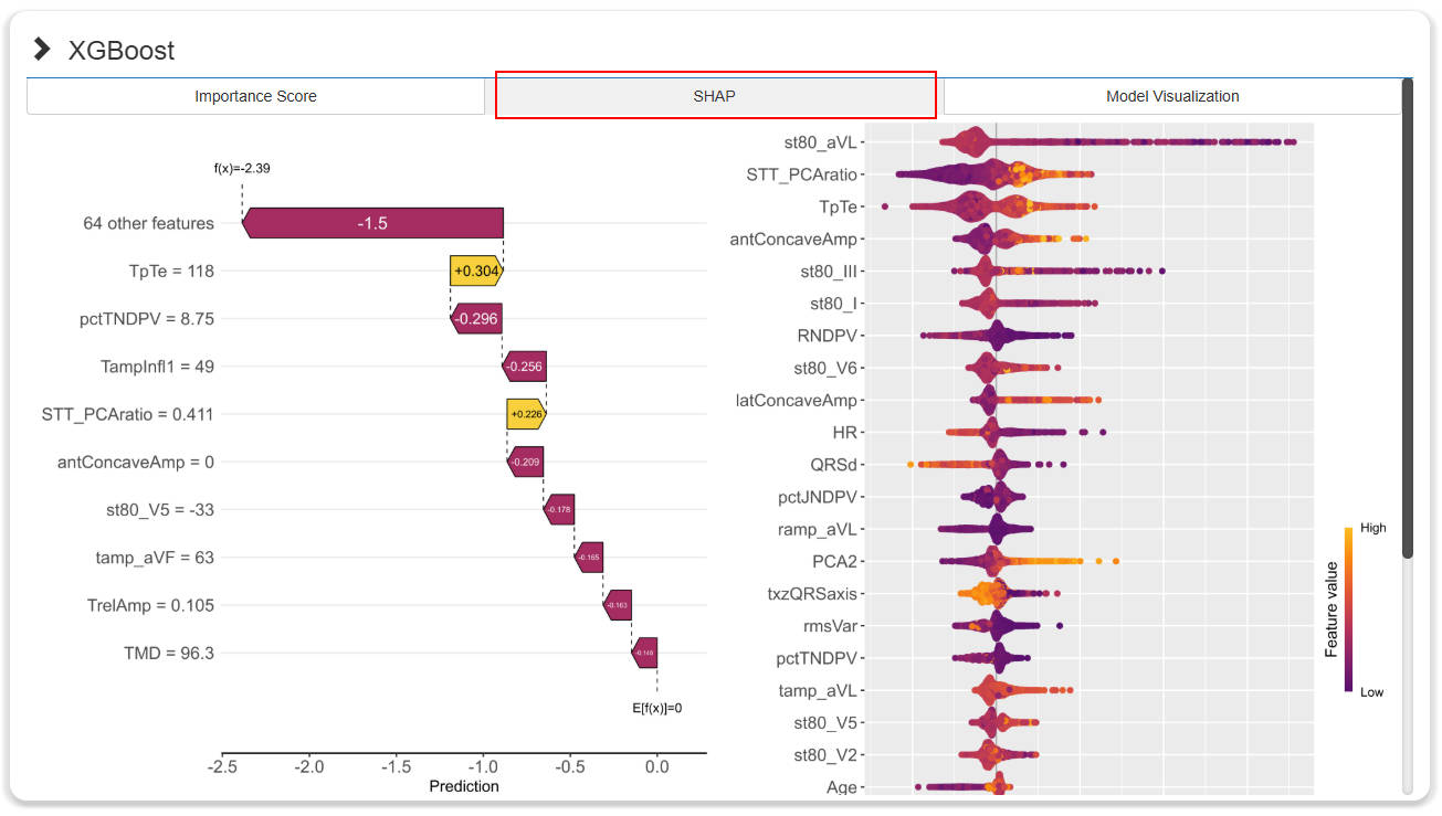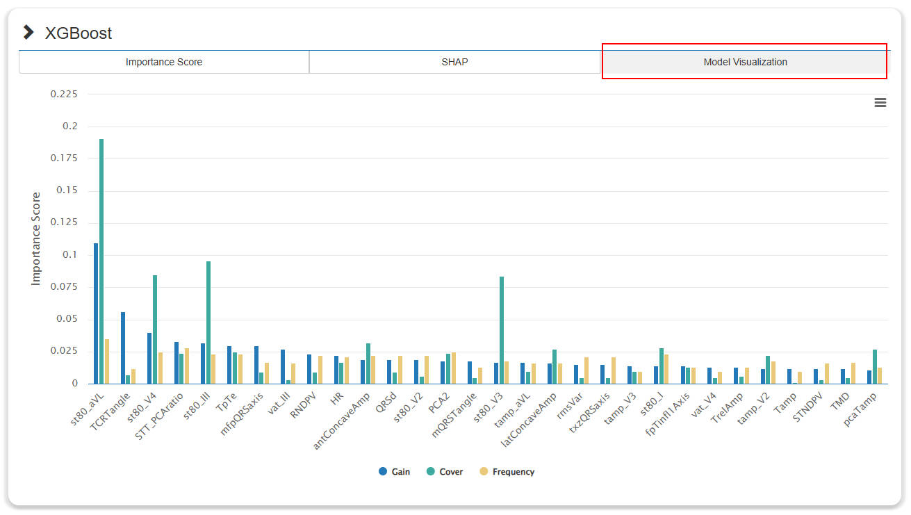 - After the generation of models, clicking on the navigation bar on the right will display the result window of the corresponding algorithm. The content in the window contains 3 sub-pages: "Importance Score", "SHAP" and "Model Visualization".