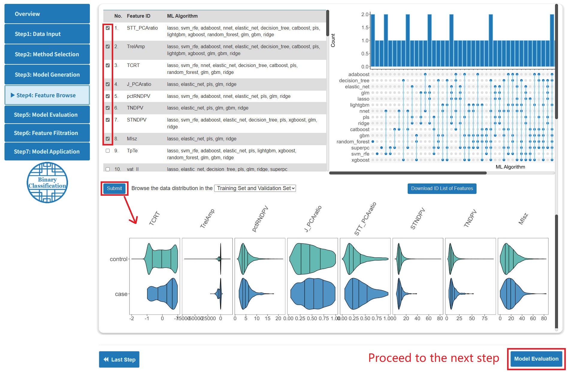 - On the "Feature Browse" page, users can browse the intersection and union of top features of models through a Upset graph, and users can select the features of interest to browse their distribution in the dataset.
