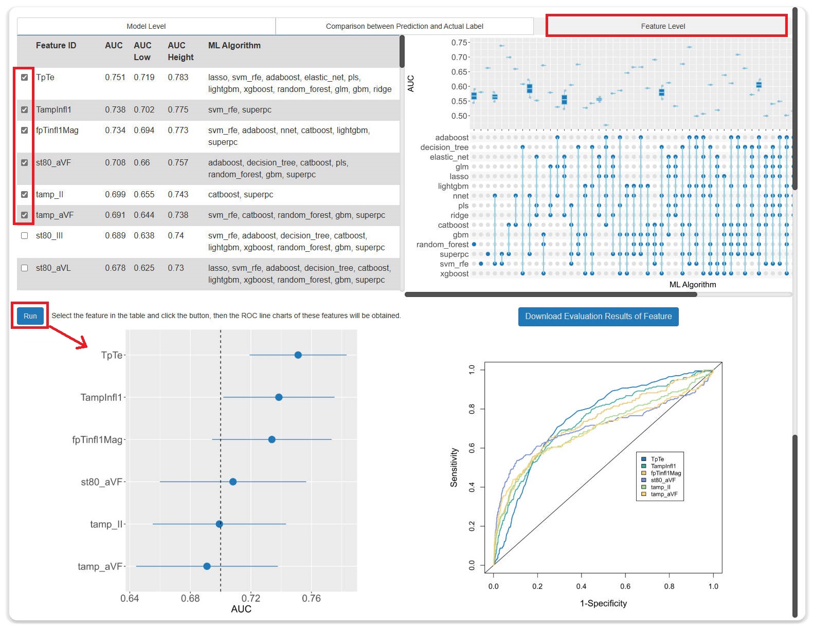 - The evaluation results consist of three parts: (1) Model-level evaluation. (2) Comparison between prediction and actual label. (3) Feature-level evaluation.