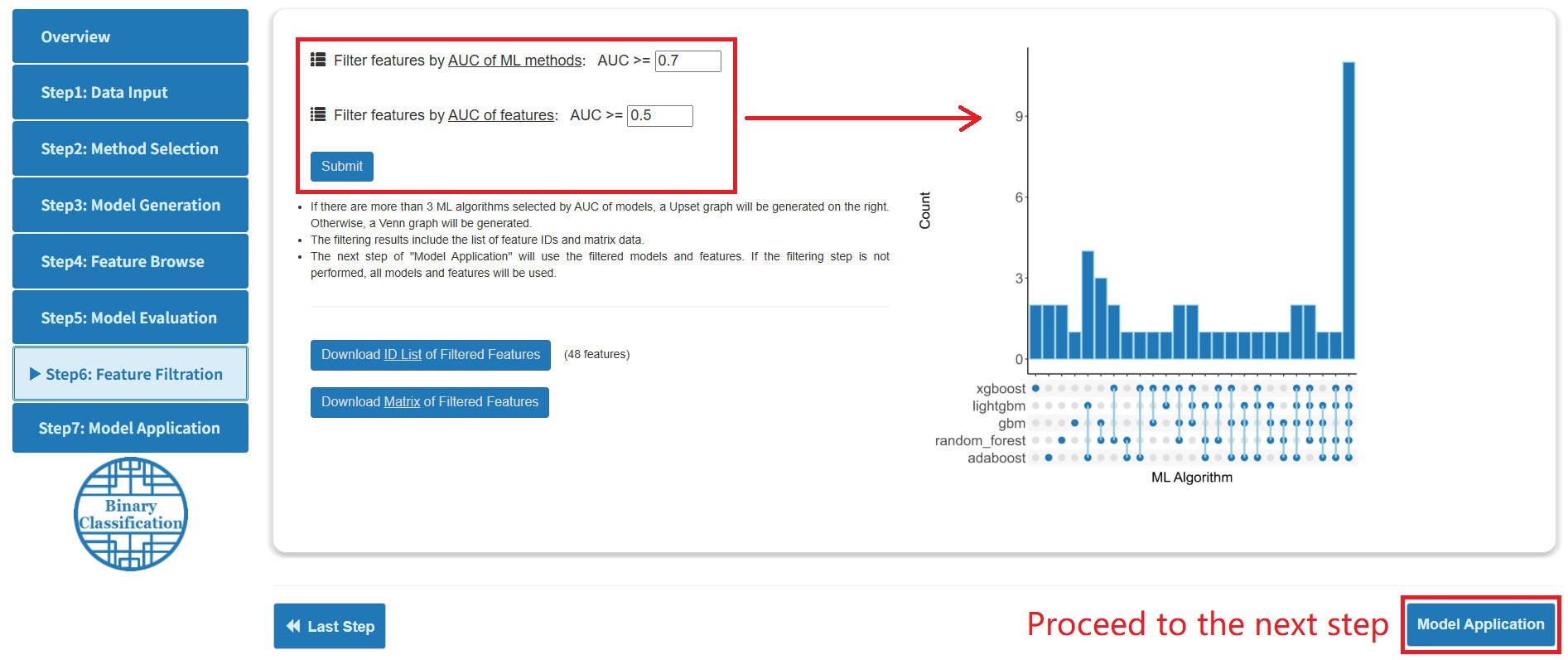 - On the "Feature Filtration" page, users can filter features by AUC / C-index. Based on the number of filtered models, MLome provides Upset and Venn diagrams to visualize the filtering results.