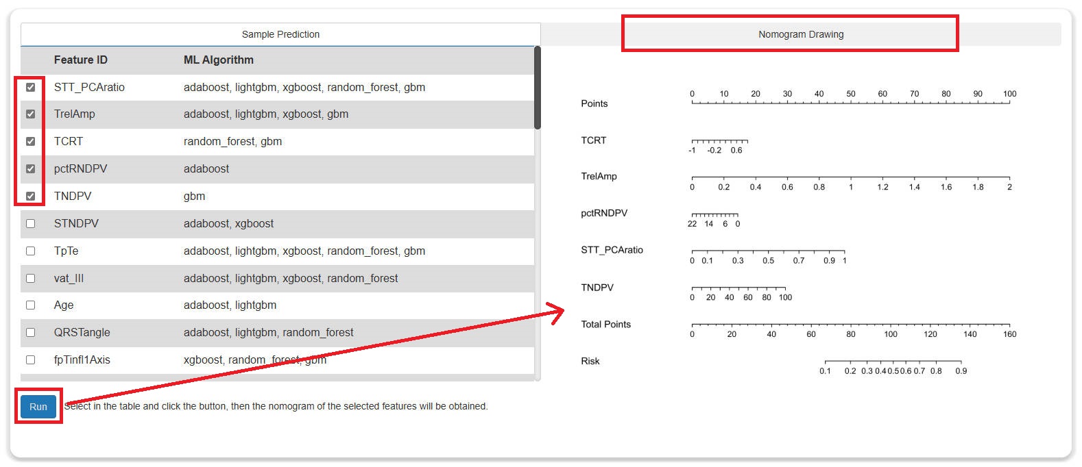 - For the latter, users can select from the features filtered out in the previous step and draw a nomogram based on these features.